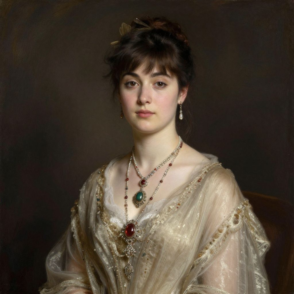 A finely detailed portrait reminiscent of John Singer Sargent's style, featuring a woman in a vintage cream gown adorned with intricate jewelry, set against a dark, moody background with dramatic lighting that highlights her elegant features and attire.