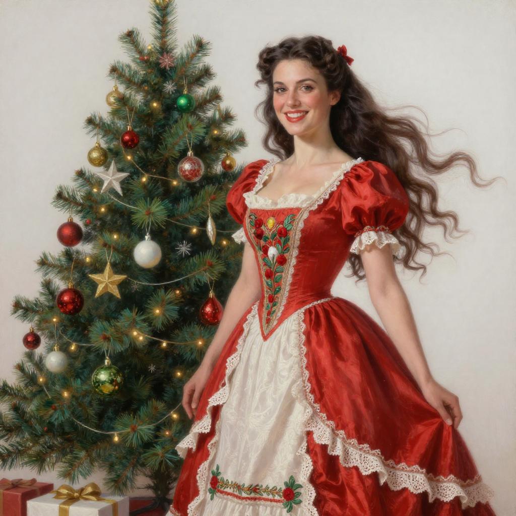 Intricate, 3D, Christmas theme, pinup, a woman, beautiful face, happy, smiling, long_flowing, hair, looking_at_viewer, fit body, Victorian dress, red_dress, white trim, lace, embroidery, Christmas tree, Christmas lights, Christmas decorations, (color scheme red and green and white, white_balanced, by artgerm and Pre-Raphaelite and Alphonse Mucha, hyper-realistic, highly detailed, realism, oil painting, beautiful, sexy, (symmetry:1.1), octane render, concept art, smooth, 8k, By Alberto D'Alessio and Todd Lockwood
