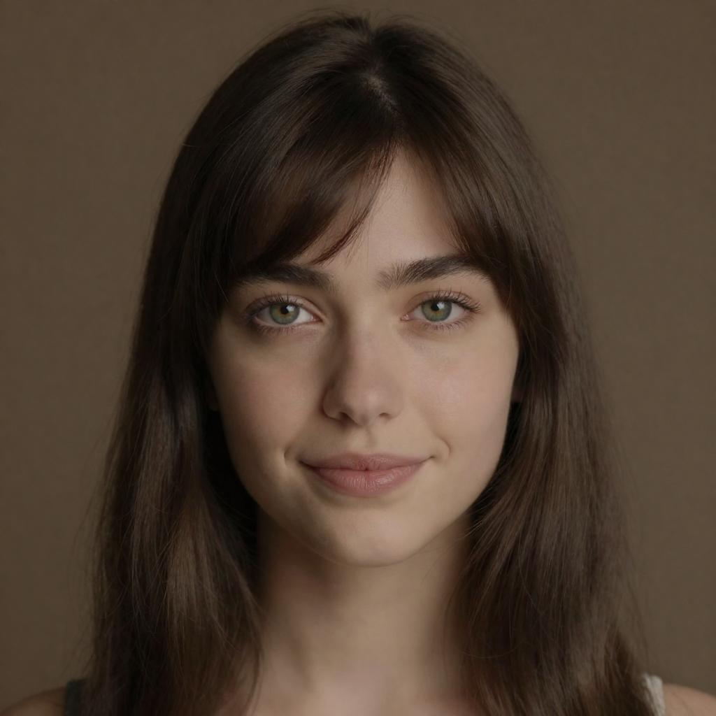 Photograph of a young woman with fair skin, green eyes, and long, dark brown hair with bangs. She has a subtle smile and is looking directly at the camera. The background is blurred with warm, brown tones. Her expression is calm and confident.