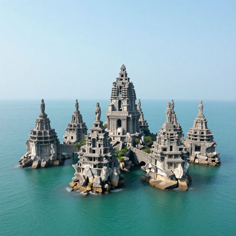 A cluster of ancient, crumbling stone castles floats serenely atop jagged rock formations in a tranquil turquoise sea, each island crowned by a mysterious statue or structure defying conventional architectural norms.