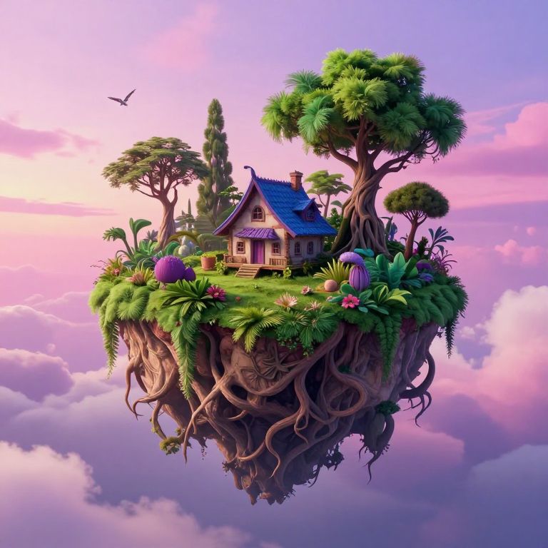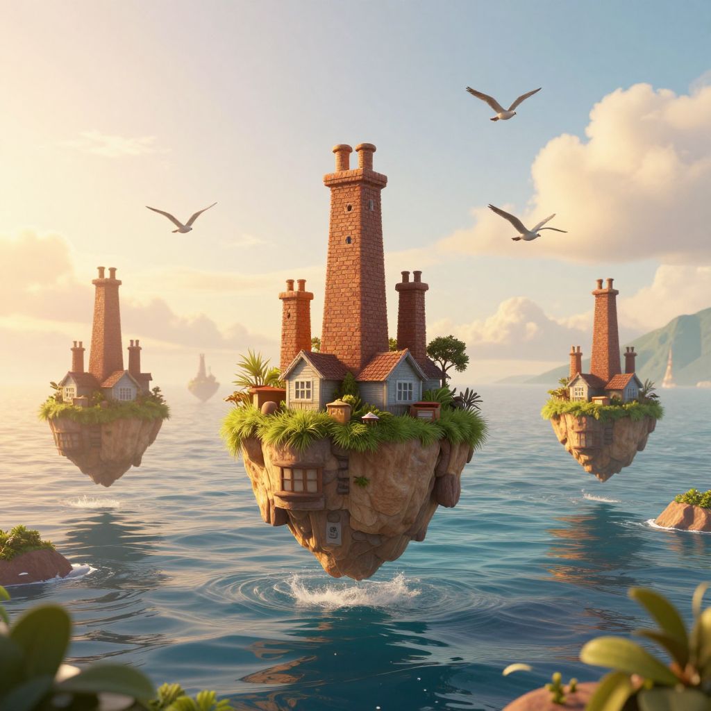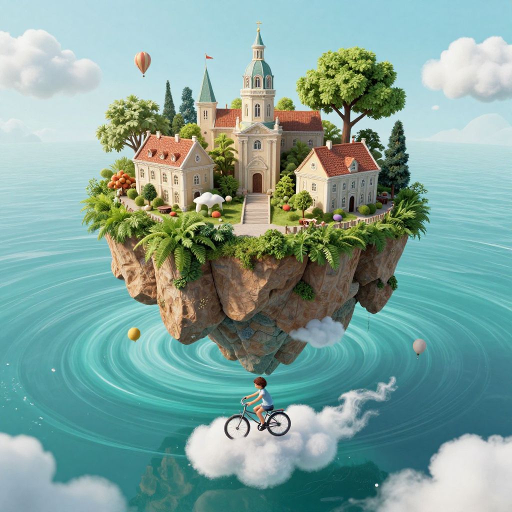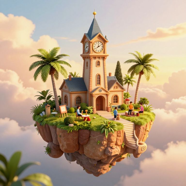 A serene 3D-rendered fantasy scene depicts a floating island adorned with a quaint, clock-tower building, surrounded by lush palm trees and vibrant greenery, where residents engage in creative activities, embodying the concept of time as artful currency under the golden-hour glow of a picturesque sky.