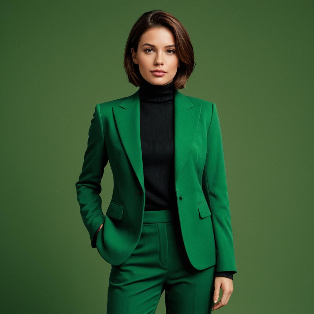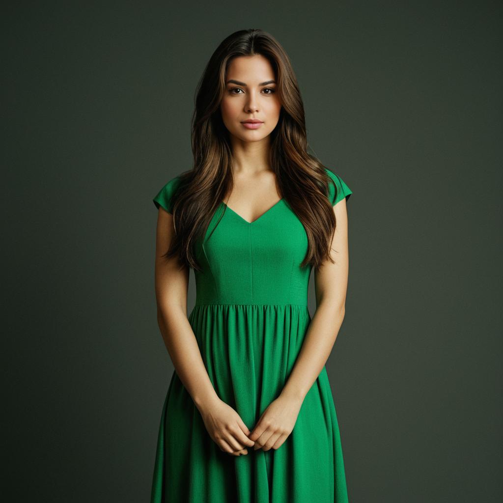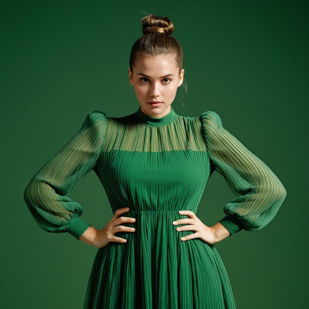 Portrait of a young woman with brown hair styled in a single bun, wearing an elegant green dress with long, see-through sleeves. She stands confidently against a matching green background, looking directly at the viewer with a closed mouth expression.