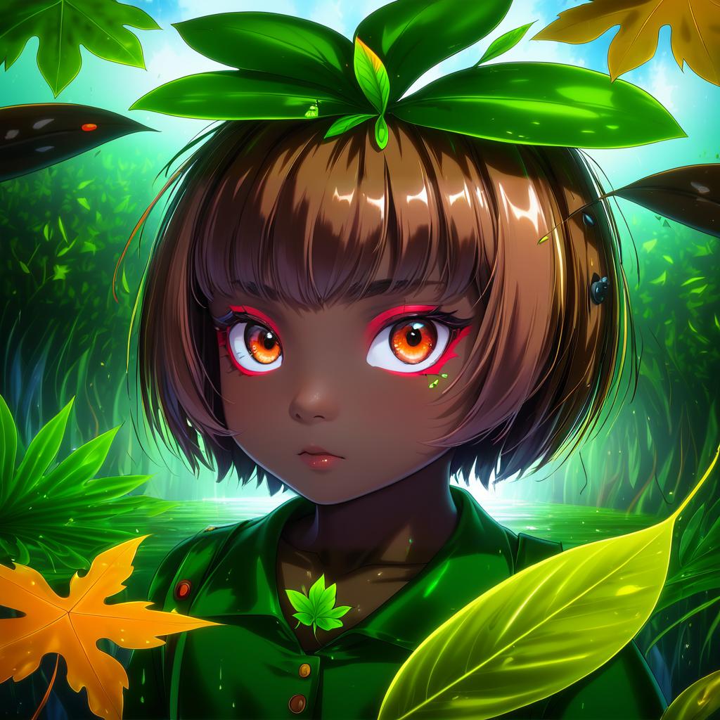 Anime-style digital artwork of a dark-skinned female character with short brown hair and bright orange eyes. She is wearing a green outfit with a small leaf accessory on her chest and a larger leaf crown on her head. Surrounded by vibrant green and yellow leaves, the background depicts a lush, mystical forest scene with vivid lighting effects.