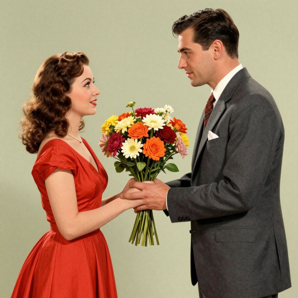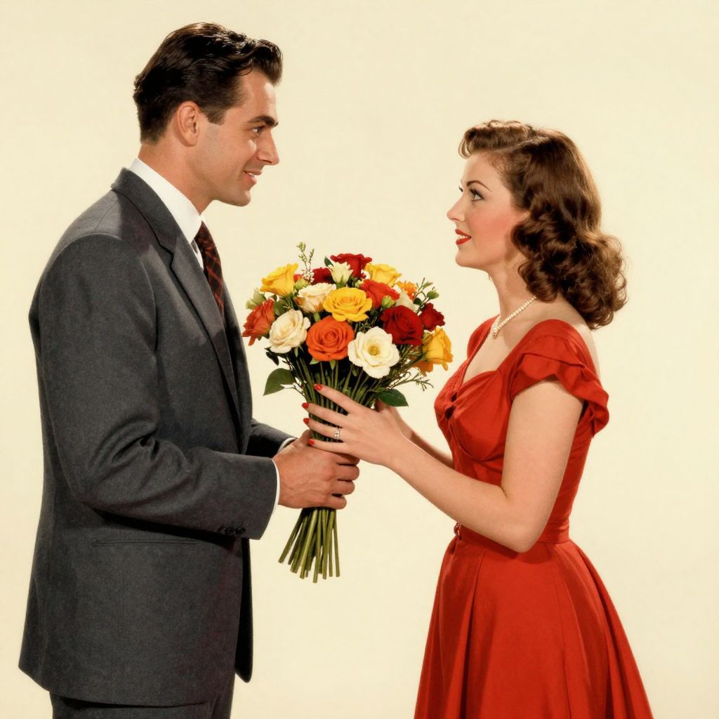 A romantic illustration in a vintage retro style depicts a man in a suit presenting a vibrant bouquet of flowers to a woman in a red dress, capturing a tender moment reminiscent of classic cinema.