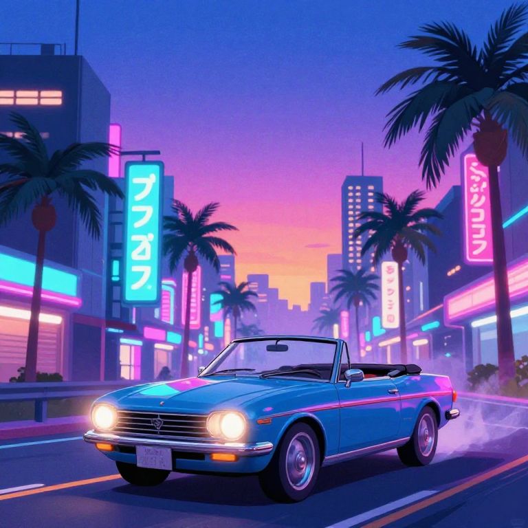 City pop album cover featuring a vintage convertible driving through a glowing cityscape, neon signs in Japanese kanji, sunset gradient sky, soft grainy texture, 80s fashion style, palm trees swaying, vaporwave color palette with blues and purples, dreamy and energetic.