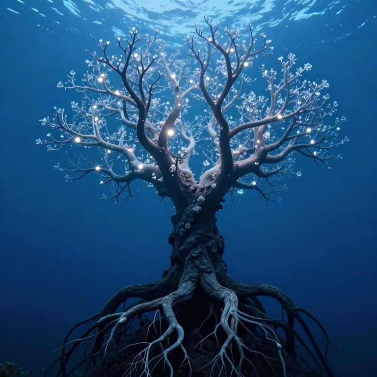 Roots sprawl outward from a gnarled trunk as a surreal, bioluminescent tree emerges upside-down from the ocean floor, its ethereal branches adorned with glowing, crystalline formations that cast a hauntingly serene light through the deep blue waters.