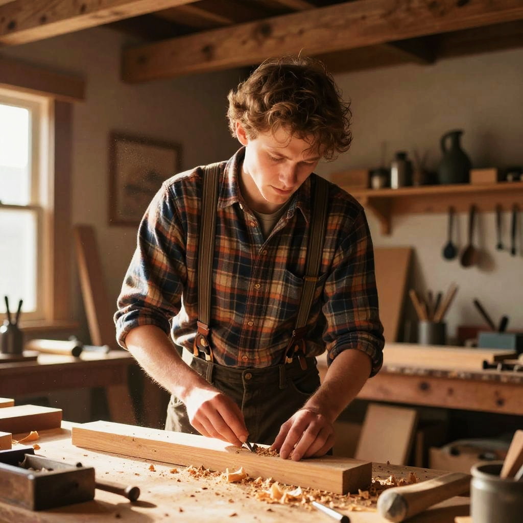 Sawyer depicted as a skilled carpenter in a cozy workshop filled with wooden beams, hand tools, and shavings floating in warm sunlight, wearing a plaid shirt and suspenders, vintage rustic style, high detail and warm tones.