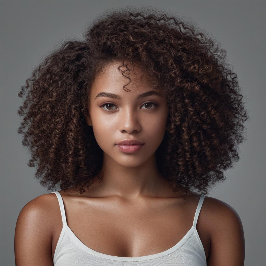 Close-up portrait of a dark-skinned young woman with voluminous curly afro hair and brown eyes. She is wearing a white camisole, showing bare shoulders and collarbone against a simple grey background. Her skin is smooth with visible freckles and natural makeup, looking directly at the viewer in a photorealistic style.