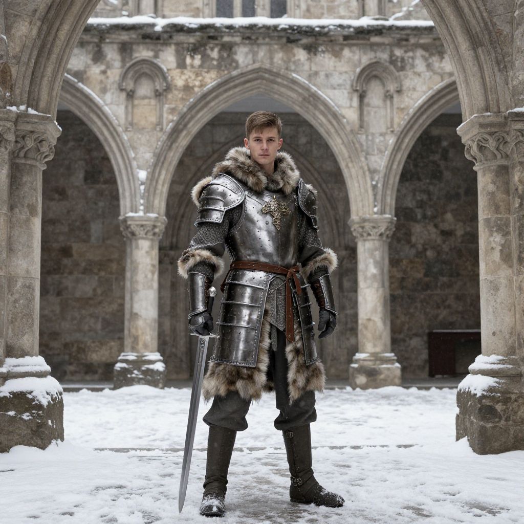 A young man stands confidently in a snowy, medieval stone courtyard, clad in detailed, polished armor with fur accents. He holds a long sword in one hand, embodying the spirit of a winter warrior poised for battle. The scene is framed by gothic arches and cold stone columns, enhancing the epic and historical atmosphere.