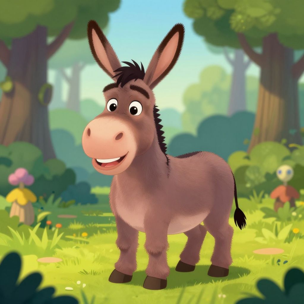 Images of donkey from shrek, cartoon style, vibrant colors, humorous expression, lively forest background, playful and friendly atmosphere, detailed character design