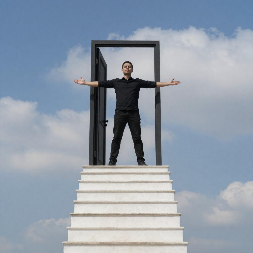 Photograph of a man standing in a black doorway at the top of a white staircase against a blue sky with clouds. He has short dark hair, a black shirt, and black pants, with arms outstretched. The staircase ascends diagonally from the bottom left to the doorway.