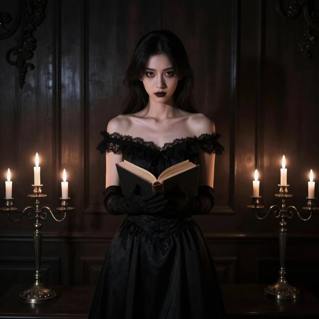 A dark, moody photograph of a serious-looking woman with long black hair, wearing a black leather jacket, choker, and lace top. She's sitting at a wooden table with three lit candles and a black ornate skull in the dimly lit, gothic-style room. Her intense gaze and the shadows create a mysterious, dramatic atmosphere.