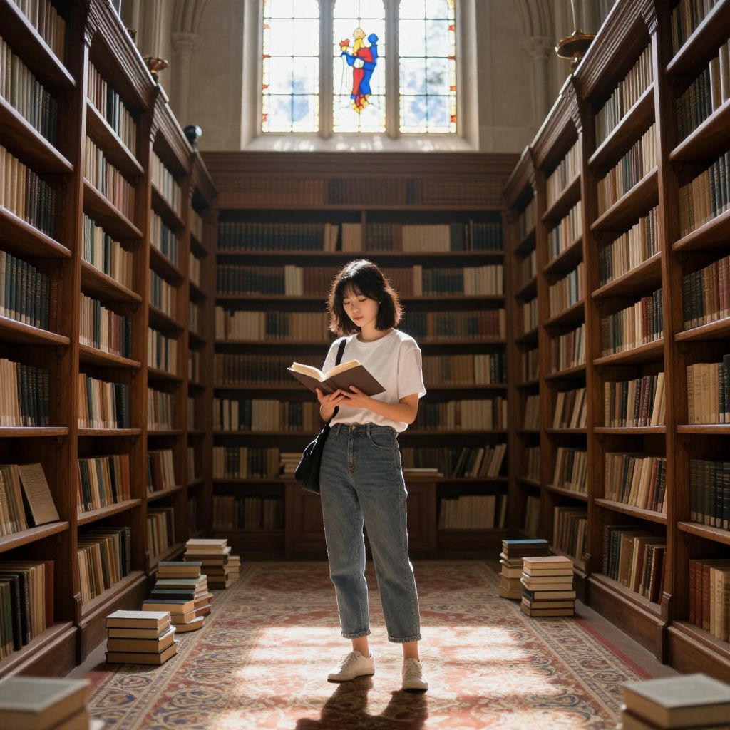 Photograph of a young woman standing in a dimly lit, narrow library aisle. She has shoulder-length dark hair, wears a white short-sleeved blouse, high-waisted blue jeans, and beige slip-on shoes. She is holding an open book with both hands, reading intently. The library shelves, filled with numerous books, line both sides of the aisle, reaching high up to the ceiling. Sunlight streams through a stained glass window at the far end, casting a warm glow on the patterned carpet and scattered books on the floor. The woman's focused expression contrasts with the serene, quiet atmosphere of the library.