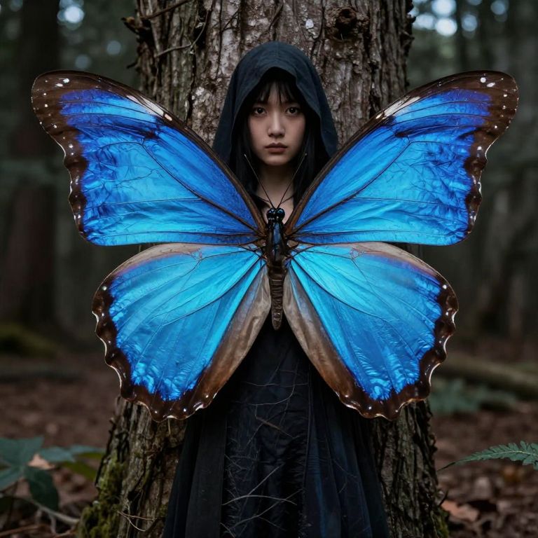 Blue butterfly halloween, butterfly wings, insect wings, solo, wings, standing, outdoors, tree, hood, old, looking at viewer