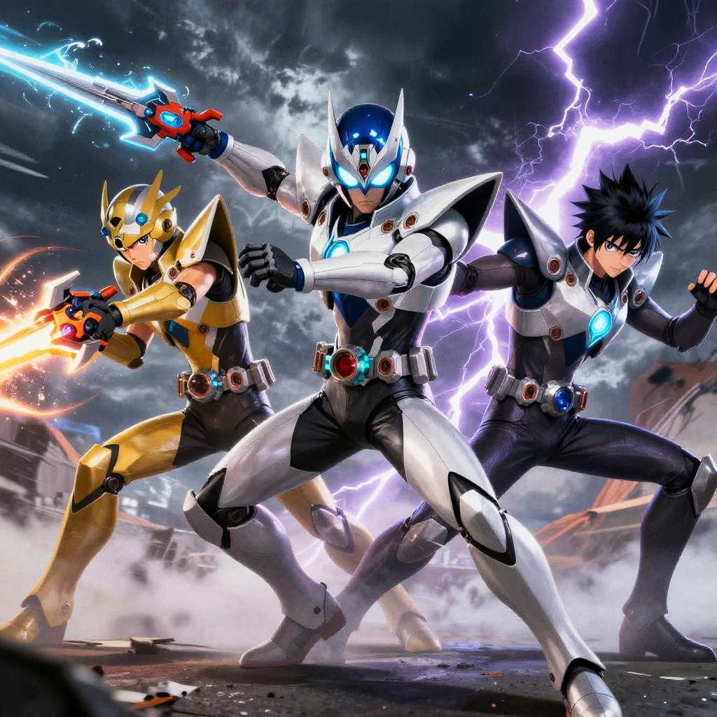 This vibrant digital anime-style illustration depicts three male characters in dynamic battle poses. The central figure, clad in a white and blue armored suit, wields a glowing blue sword, surrounded by electricity. To the left, a character in yellow and black armor with a horned helmet fires a red energy beam. On the right, a black-haired character in a black and white suit emits purple electricity. The background is a stormy, dark sky with lightning illuminating the scene. The characters' expressions are intense, and they wear futuristic belts with red and blue accents. The ground is dusty, adding to the chaotic atmosphere.