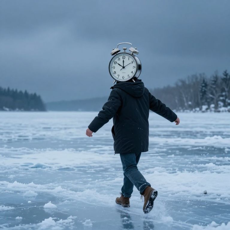 Photograph of a person walking on a frozen lake, viewed from behind. The person wears a black winter coat, blue jeans, and brown boots. Instead of a head, they have a large white analog alarm clock with black hands and numbers, showing the time as approximately 10:10. The background features a snowy, overcast sky and a distant, tree-lined shore. The frozen lake reflects the overcast light, creating a cold, wintery atmosphere. The person's arms are outstretched for balance.