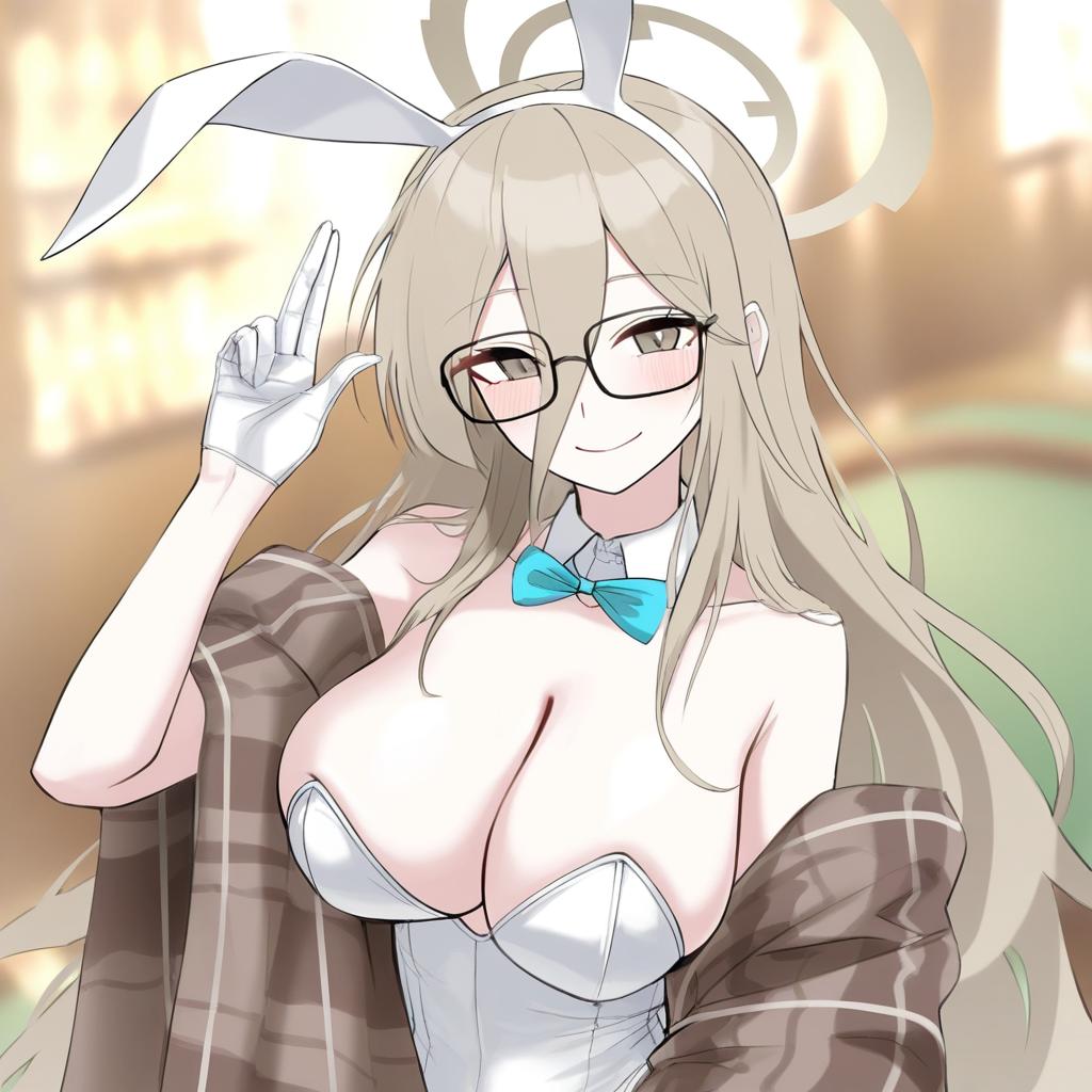 Akane (bunny) (blue archive), blue archive, 1girl, rabbit ears, fake animal ears, hair between eyes, brown eyes, glasses, black-framed eyewear, light brown hair, long hair, brown hair, very long hair, large breasts, cleavage, white leotard, strapless leotard, white gloves, halo, detached collar, bare shoulders, aqua bowtie, blue bowtie, playboy bunny, playboy bunny, shawl, by artist akisora, leet