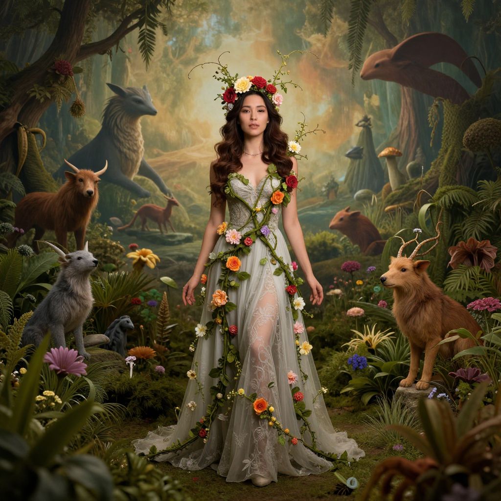 A woman adorned with flowers and vines, standing amidst a lush, fantastical landscape filled with mythical creatures and plants.