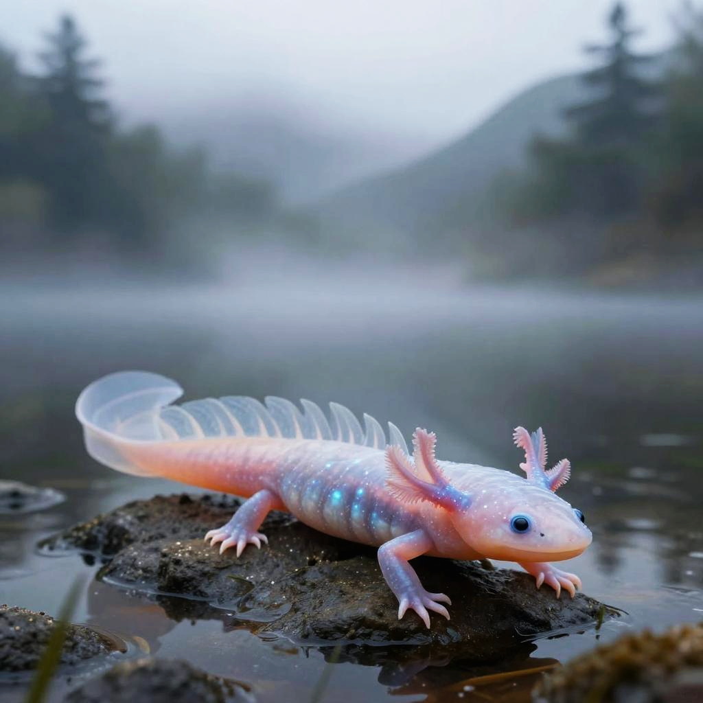 Axolotl water dragon emerging majestically from a misty mountain lake, sleek and translucent body with bioluminescent patterns, fantasy style, serene and magical atmosphere