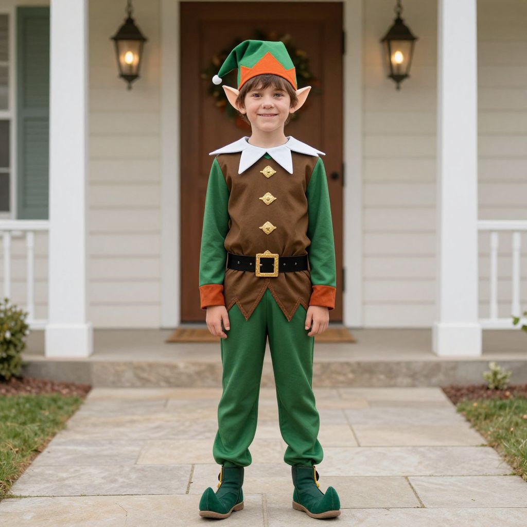 Elf Costume Boy, boy in green and brown outfit standing in front of a house