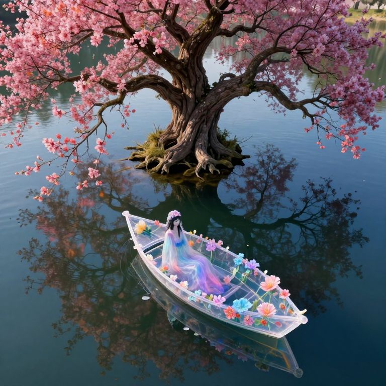 A serene digital artwork depicts a woman standing on a small boat amidst a tranquil river, gazing at a vibrant rainbow piercing through dramatic clouds, evoking a dreamlike, impressionistic atmosphere with high-definition detail and ethereal lighting effects.