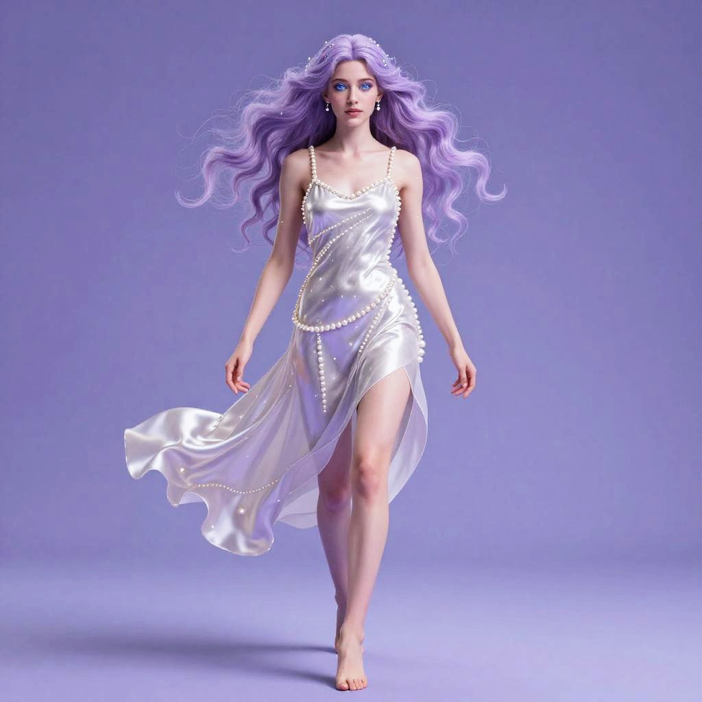 Celestial enchantress with pastel lavender hair, walking gracefully, every step mesmerizing, crystal blue eyes, silken pearl skin, a vision of divine beauty and supernatural grace, ethereal and captivating.