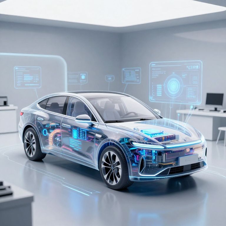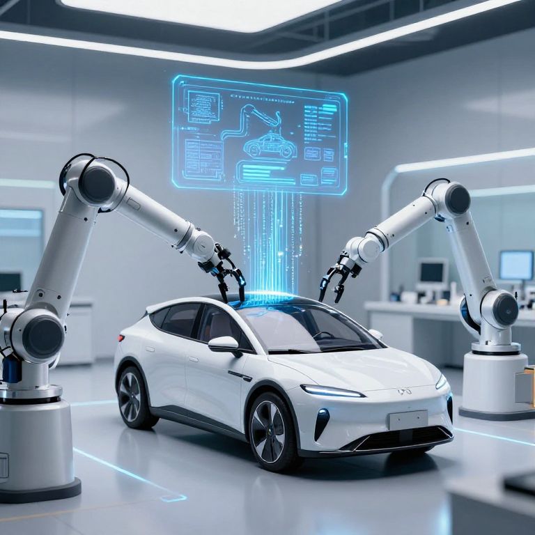 Car AI generator visualization, robotic arms assembling a smart, self-driving car, digital code streams flowing around, holographic blueprints displayed mid-air, white and metallic silver color palette, clean modern lab environment, hyper-detailed technology focus