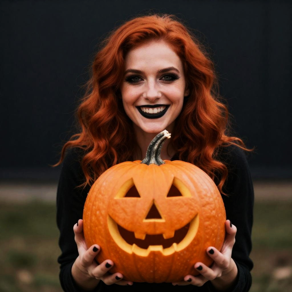 Smiling woman with long curly red hair and black lipstick holding a carved jack-o'-lantern pumpkin. She is wearing a black top and has black nail polish. The background is dark, emphasizing the Halloween theme.