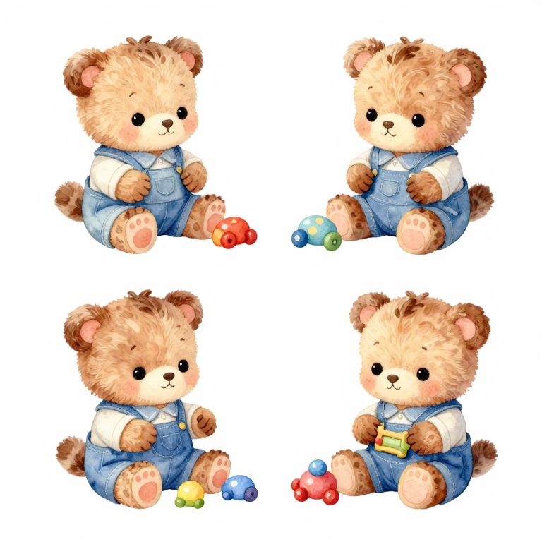 This is a digital illustration featuring four identical, adorable teddy bears with fluffy, light brown fur and dark brown ears and paws. Each bear is dressed in blue denim overalls with white shirts underneath. They are seated in a square arrangement on a white background, each holding different colorful toys: red, green, and blue cubes (top left), red and blue cubes (top right), yellow and red cubes (bottom left), and a red and yellow toy car (bottom right). The bears have large, black, round eyes and small, black noses, giving them a cute, innocent expression. The illustration style is whimsical and child-friendly, with soft, pastel colors and a gentle, textured fur effect.