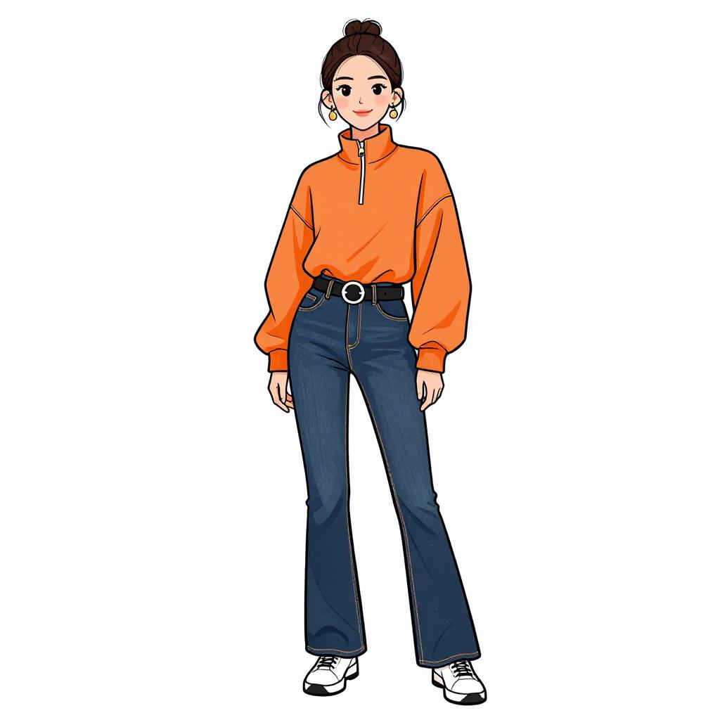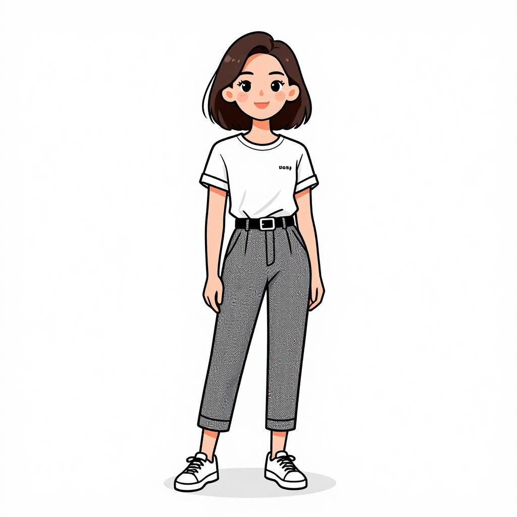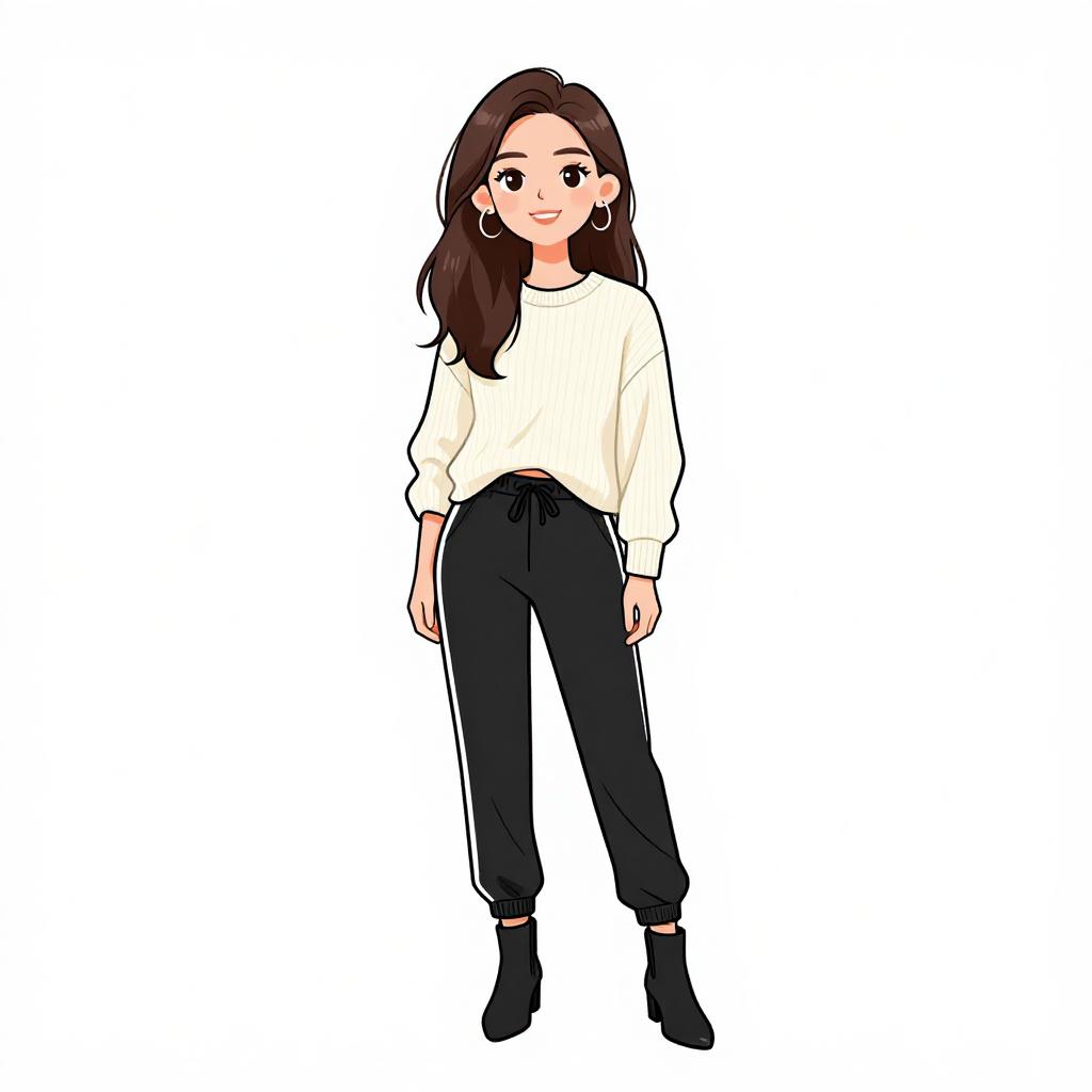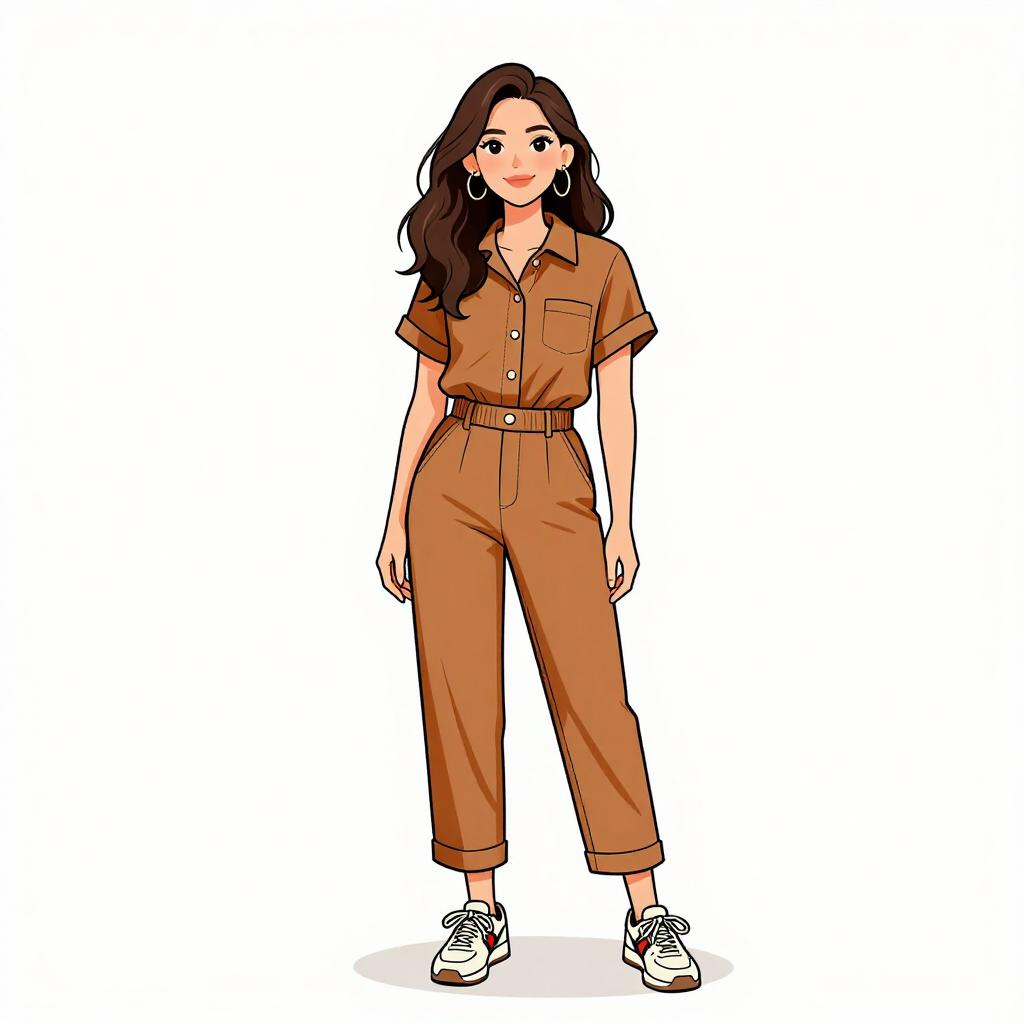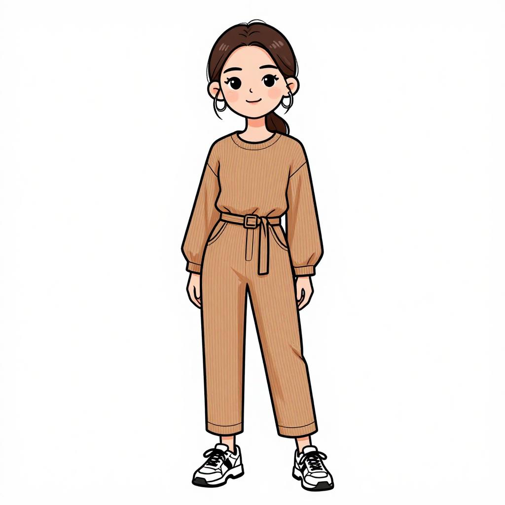Woman with pretty face and pretty hair. smiling Woman, minimalist, camel-toned belted jumpsuit with a subtle ribbed texture, long sleeves, round neckline, straight-leg pants, chunky white and black sneakers, delicate hoop earrings, hair parted in the middle and styled into a low ponytail, white studio background. --sref 1467