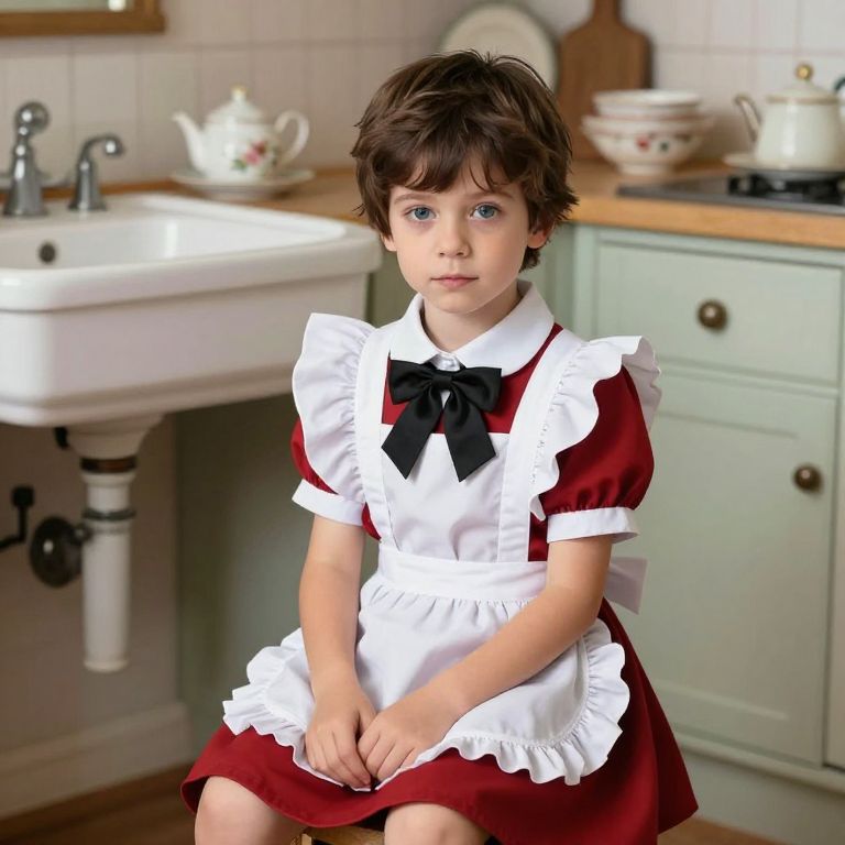 A slender boy with dark brown hair and kind blue eyes wearing a traditional maid outfit with a white apron, red sleeves, and a black bow, seated on a small stool in a vintage-style house kitchen with a ceramic sink and vintage china, detailed and realistic shot