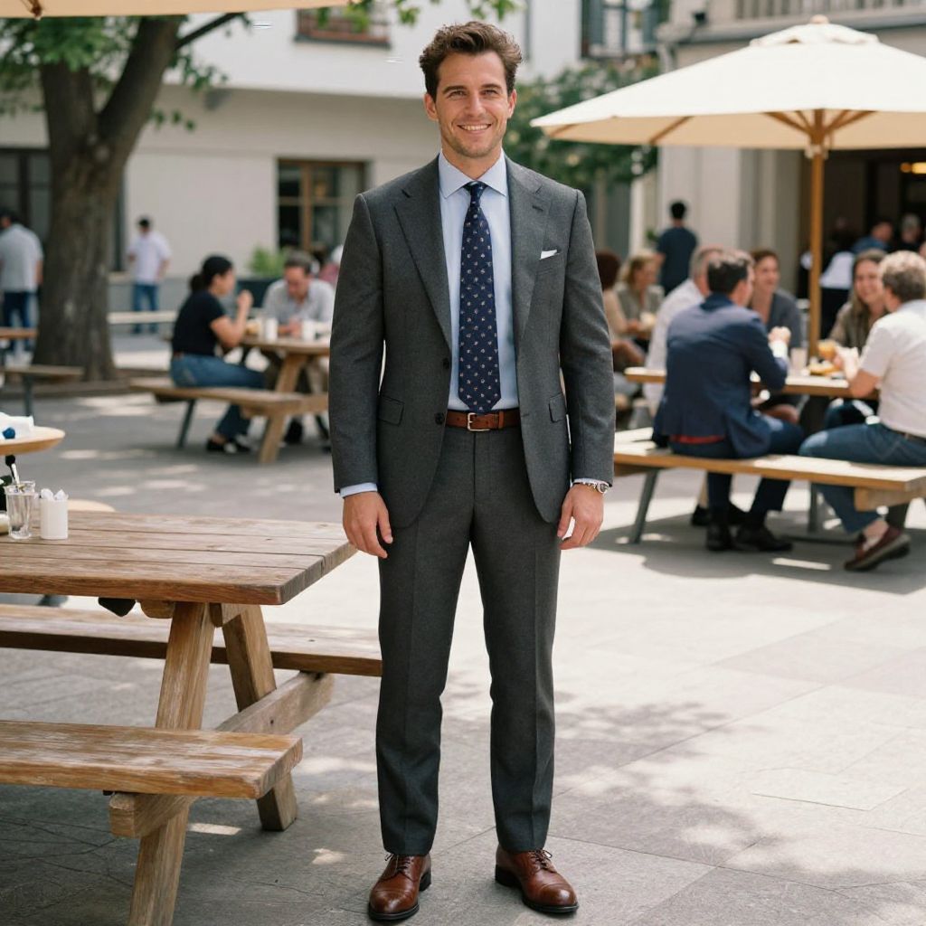 A man, charcoal gray slim fit suit, light blue dress shirt, patterned silk tie in navy, brown leather brogues, coordinating brown leather belt, sun-drenched plaza, wooden picnic tables, cheerful laughter and chatter, technicolor analog film stock, confident smile. Man has masculine face and piercing eyes
