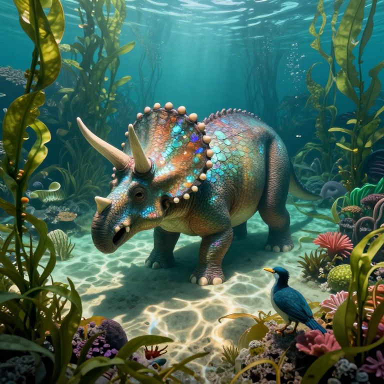 Imagine an underwater realm reminiscent of James Gurney's enchanting world, where crystal-clear channels interweave around a regal Triceratops statue adorned with luminescent algae. From the perspective of a tiny explorer, observe a curious blue-footed penguin as it traverses this aquatic maze, delving into the submerged ruins of an ancient library teeming with vibrant marine life. This scene captures the serene exploration of underwater worlds while instilling a sense of wonder and discovery, harmoniously blending fantasy with the natural beauty of our oceans.