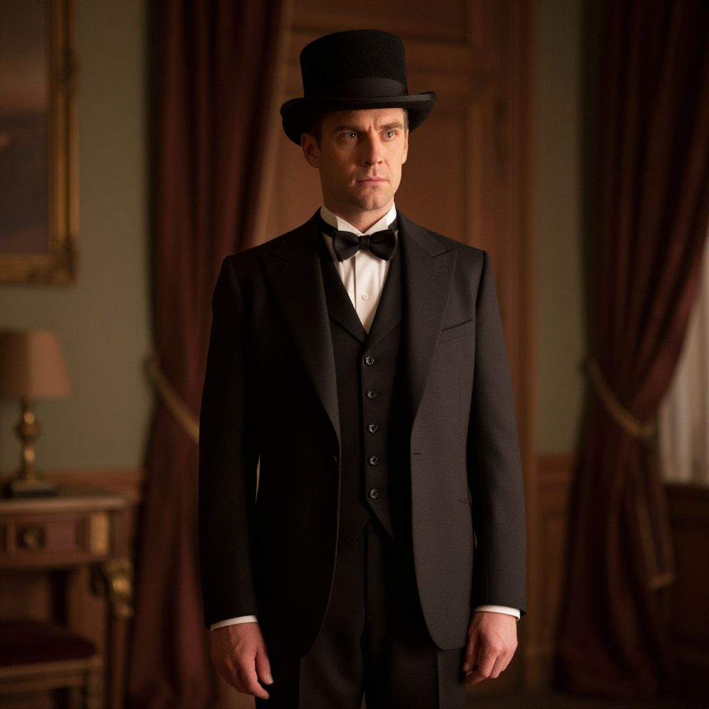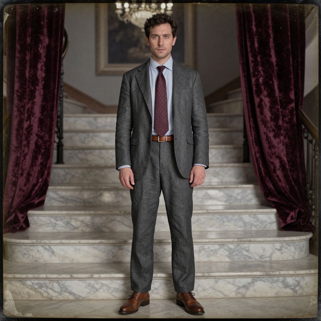 A man, charcoal grey linen suit, light blue dress shirt, patterned burgundy tie, brown leather brogues, matching brown leather belt, grand marble staircase, ornate chandeliers, velvet curtains, collodion wet plate style, confident expression. Man has masculine face and piercing eyes