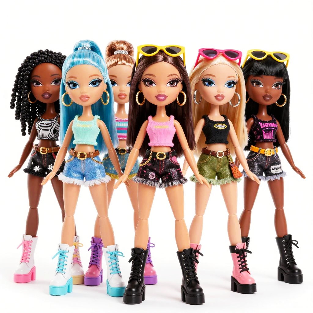 A diverse group of six Bratz fashion dolls standing in a lineup against a white background. Each doll features unique bold hairstyles, makeup, and contemporary outfits combining vintage and modern trends. The dolls wear colorful crop tops, denim shorts, chunky platform boots, and accessories such as large hoop earrings and sunglasses. The image is a highly stylized and polished 3D render with studio lighting.