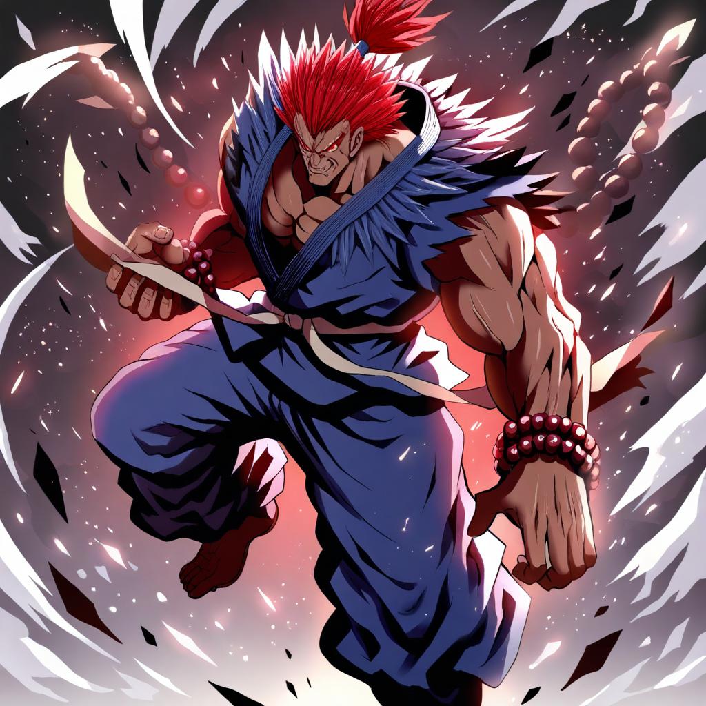 Akuma (street fighter), street fighter, 1boy, dark-skinned male, red eyes, red hair, dougi, topknot, muscular, muscular male, prayer beads, dougi, by artist hanada hyou, animagine