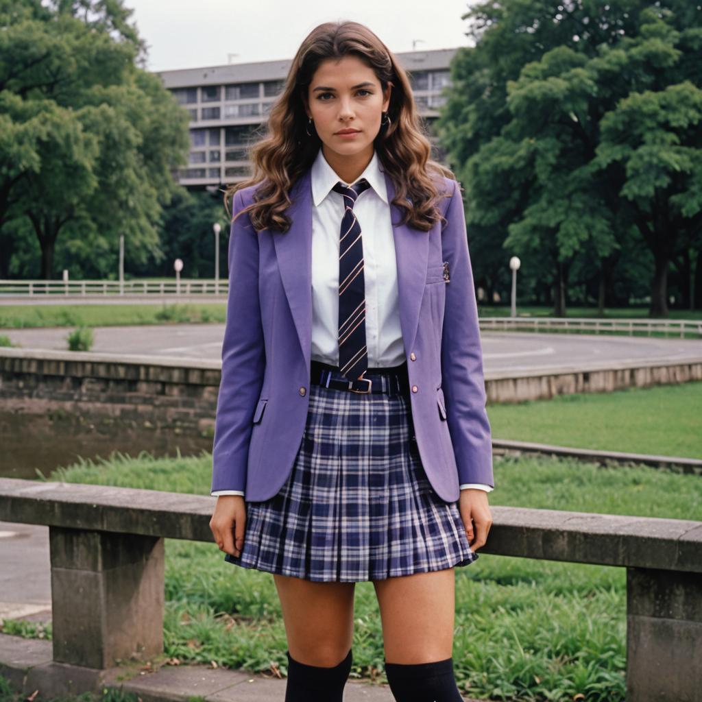 Photo of a Adequate woman, Long Wavy Hair, rebelde outfit, preppy school uniform with a Lavender Rayon blazer, white shirt, black tie, plaid skirt, knee-high socks, Dramatic Heels, early 2000s fashion, youthful, rebellious, Latin American pop culture, Ventilation Bridge, dynamic expressionism