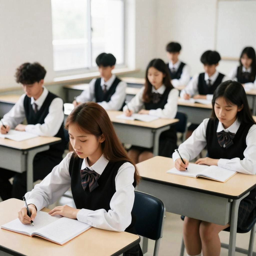 Photograph of a classroom with students in black vests over white shirts. Eight students, both male and female, sit at desks. They are focused on writing or reading. Black chairs, desks with notebooks and pens. Bright room with large windows. Students have light to medium skin tones, brown to black hair. Background shows more desks and windows. One female student with light brown hair and serious expression in the foreground. Other students have neutral or focused expressions.