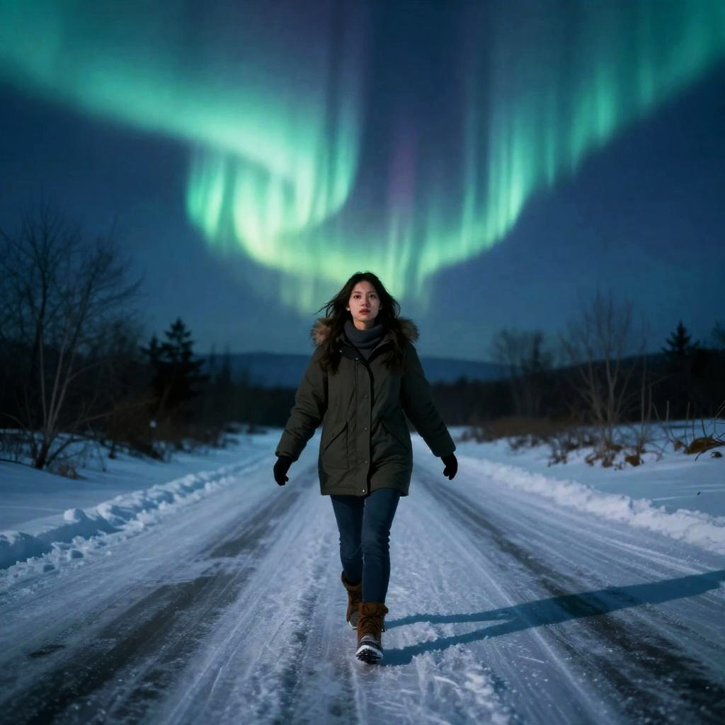 Young woman and her husky gazes peacefully at the northern lights, surrounded by cool blue and green hues, in a digital watercolor style that captures ethereal calm. The scene is enriched with translucent glass accents and features delicate textures rendered in 4k quality.