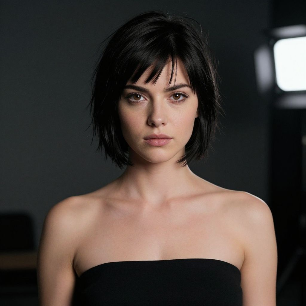 Photograph of a young woman with short, dark brown hair, wearing a gray tank top and silver necklace, standing against a blurred green and pink background