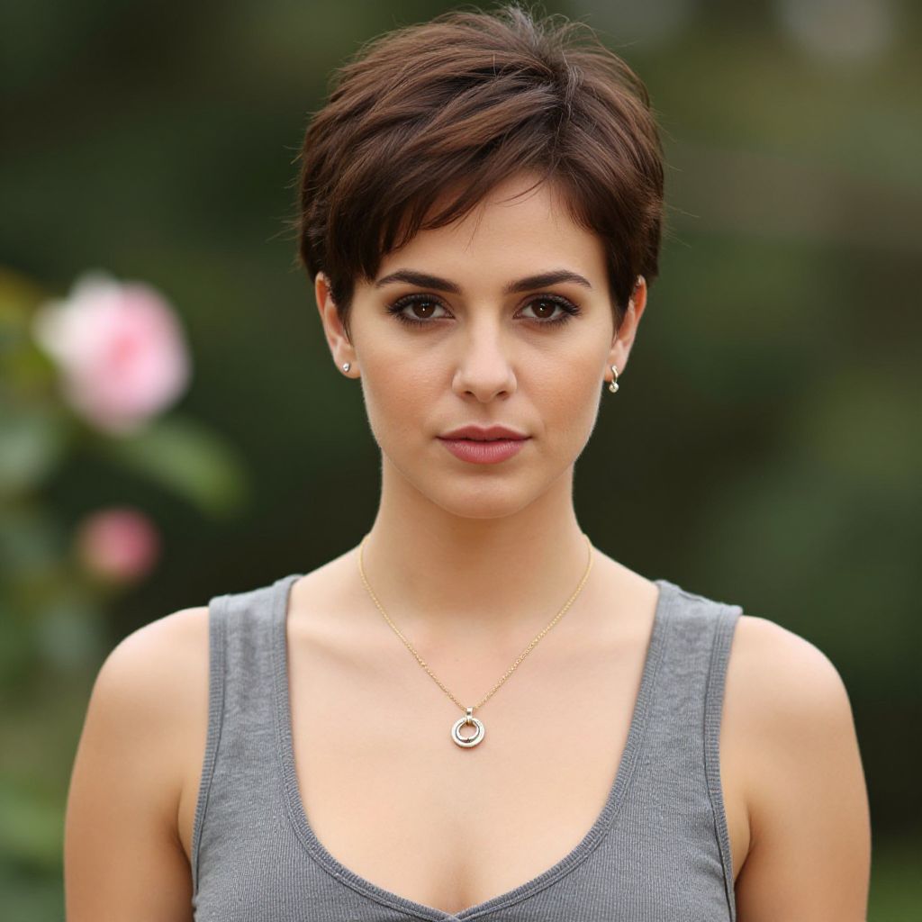 Photograph of a young woman with short, dark brown hair and fair skin, standing outdoors. She has dark brown eyes, subtle makeup, and wears small, silver stud earrings. Her outfit consists of a sleeveless, grey tank top that reveals her shoulders and collarbone. She is also wearing a delicate silver necklace with a circular pendant. The background is blurred greenery with a soft pink flower on the left, creating a natural, serene setting. Her expression is calm and slightly serious, and the lighting is natural, highlighting her features.