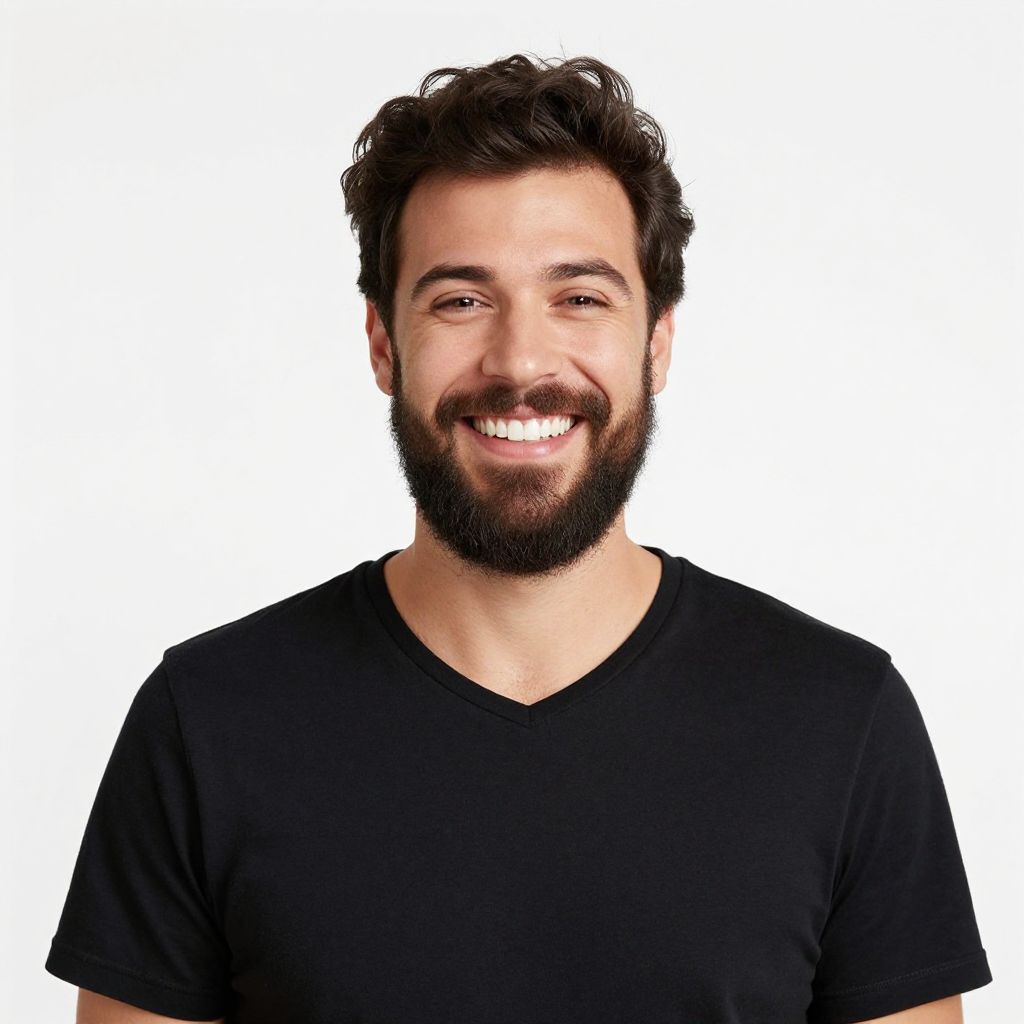 Photograph of a smiling man with medium-length, wavy dark brown hair and a full black beard. He has light skin and brown eyes. He is wearing a simple black V-neck t-shirt. The background is completely white, making the subject stand out prominently. The man's expression is friendly and approachable, with his teeth visible in a broad smile. The image is well-lit, highlighting the texture of his hair and beard, and the fabric of his t-shirt is smooth and slightly fitted.