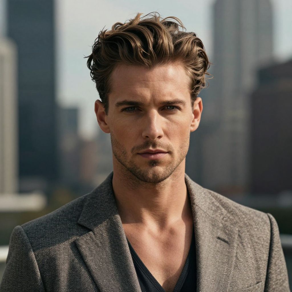 Platinum blonde, fit European man, realistic photography, candid urban setting, natural lighting, well-fitted clothing, sharp features, confident gaze, high resolution, 4k, professional portrait, 2024, cinematic composition, detailed facial hair, realistic textures
