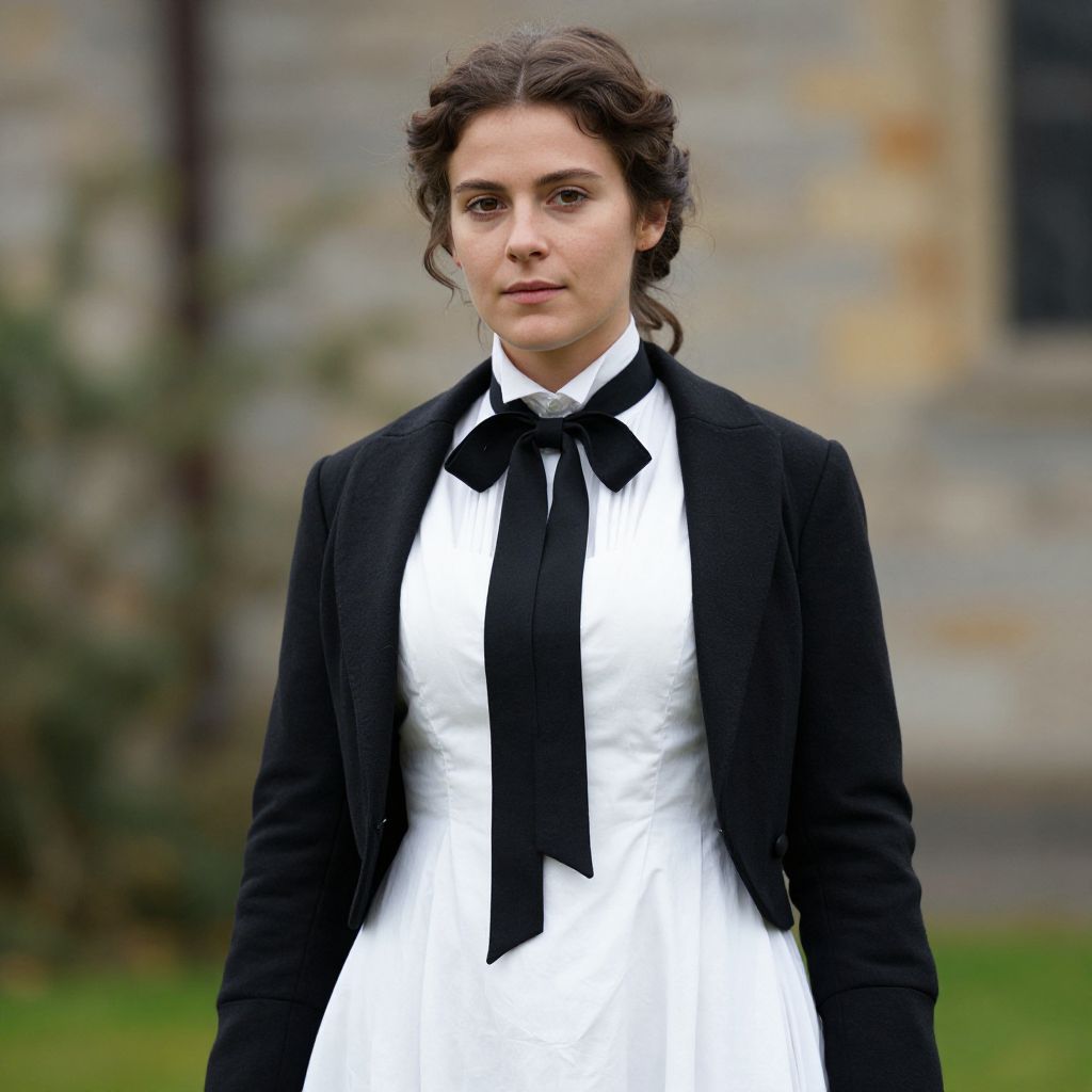 Photograph of a Caucasian woman with wavy brown hair, wearing a black blazer over a white dress with a black ribbon tie. She has a serious expression and stands against a blurred background of a stone building with greenery. Her blazer is fitted, and the white dress is plain with a high neckline. The lighting is natural, and the focus is sharp on her, with the background slightly out of focus. The overall style is formal and slightly vintage.