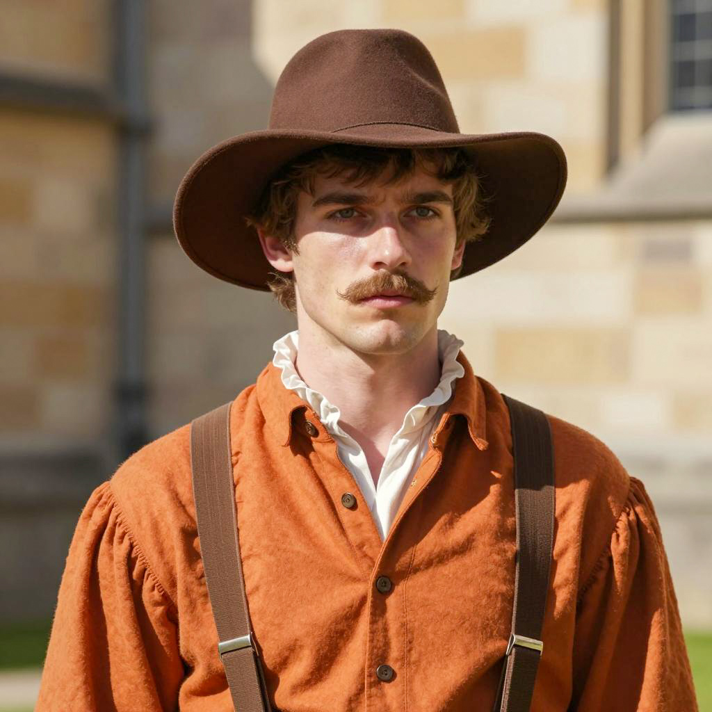 Man tudor costume, photorealistic portrait of a handsome young man, short brown hair, mustache, wearing a brown wide-brimmed hat, orange long-sleeve shirt with brown suspenders, white ruffled shirt underneath, stone building background, sunlight, serious expression, close-up, detailed ures, historical clothing, daytime, medium shot