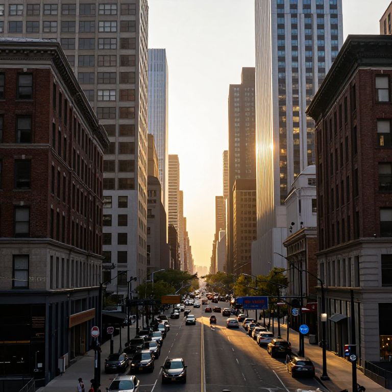 Sunrise bathes a bustling cityscape in golden light, casting elongated shadows as vehicles navigate a symmetrical avenue flanked by historic brick buildings and modern skyscrapers, creating a serene yet dynamic urban panorama.