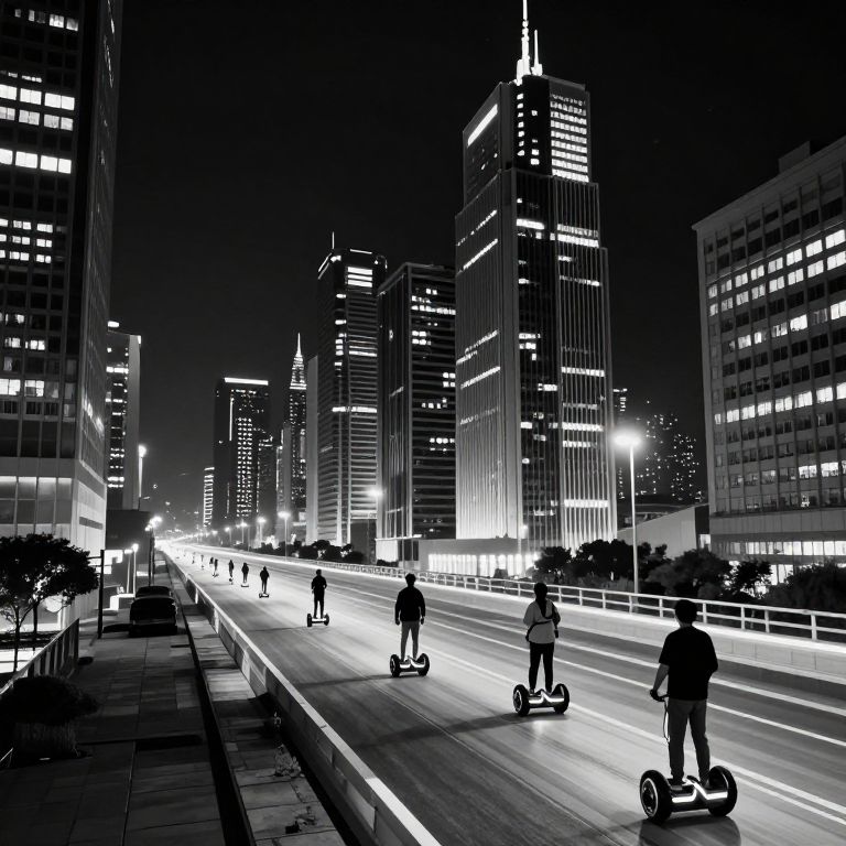 A futuristic city at night, with tall, illuminated buildings and citizens flying on hoverboards, all depicted in black and white.