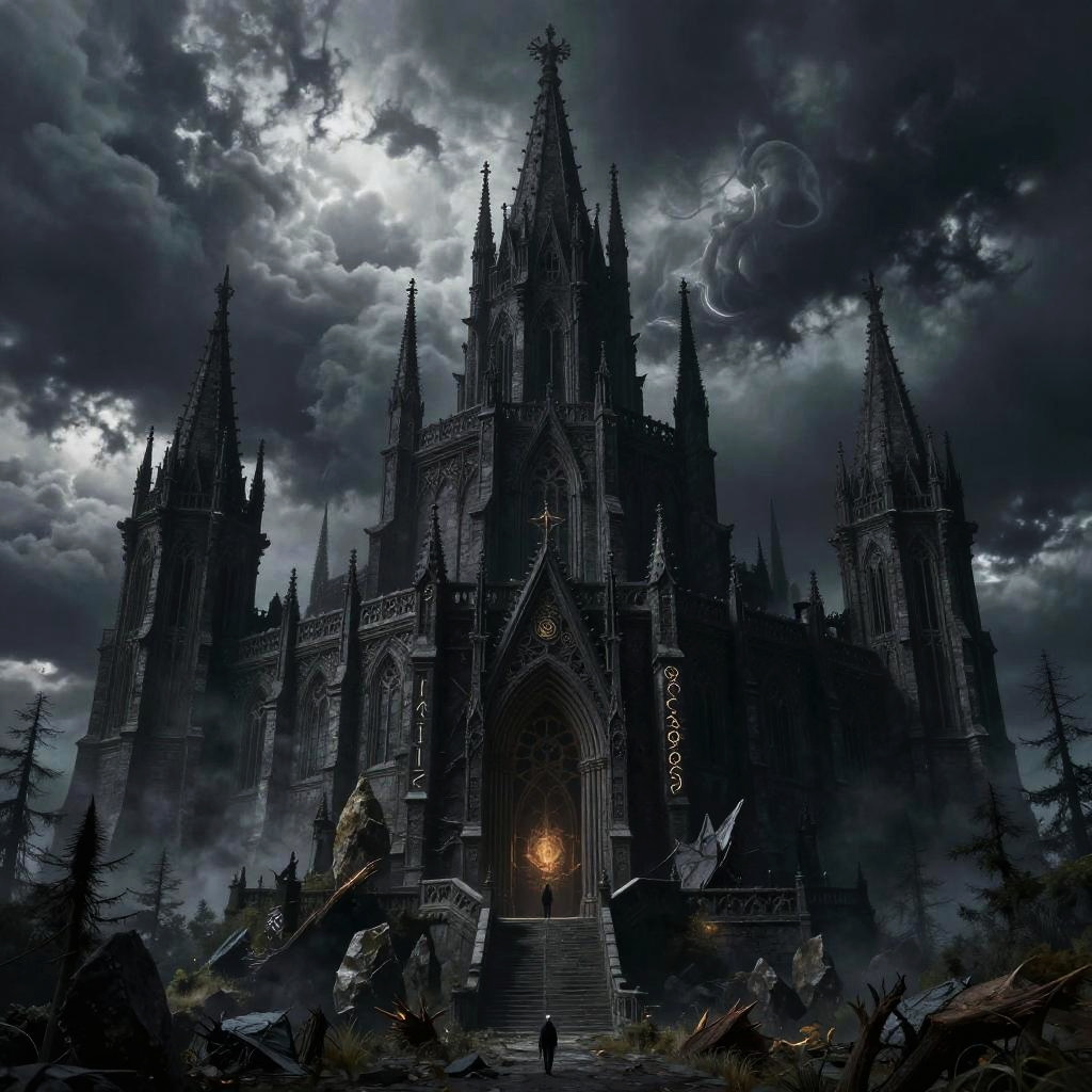 Dark castle art, sprawling dark fortress surrounded by a haunted forest, featuring intricate gothic architecture, swirling dark clouds, jagged rocks, and glowing mystical runes on the walls