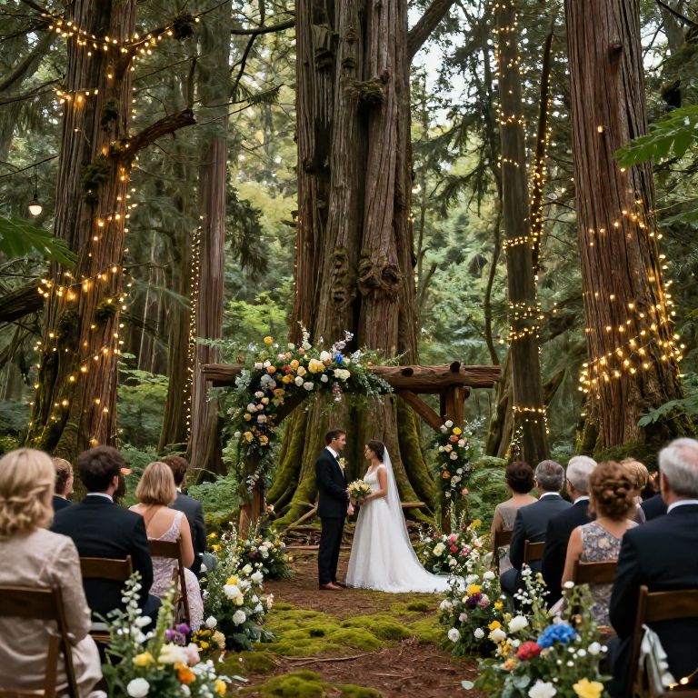 Photograph of an outdoor wedding ceremony in a dense forest. A bride in a white gown and a groom in a black suit stand at a wooden arch adorned with flowers and twinkling lights. Tall redwood trees surround them, creating a natural canopy. Guests, dressed in formal attire, sit on wooden chairs facing the couple. The forest floor is covered in moss, and floral arrangements with various colors line the aisle. Warm string lights hang from the trees, adding a magical glow to the scene. The background is lush with greenery.