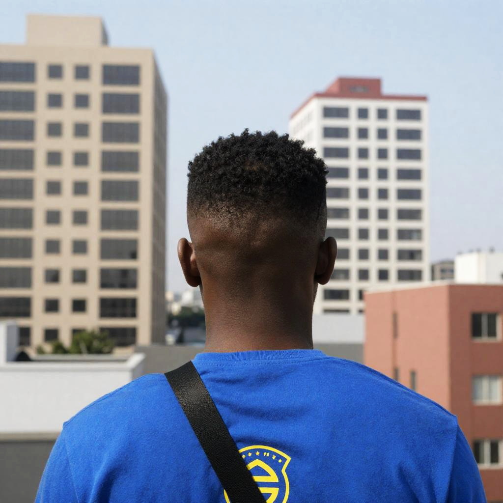 Photograph of a black man with short curly hair, back to the camera, wearing a blue shirt with a yellow emblem, and a black strap across his shoulder. He stands on a rooftop, facing a cityscape with several tall, multi-story buildings. The buildings have varied colors and window arrangements. The sky is clear and slightly overcast.